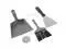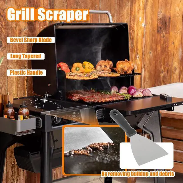 2 scrapers with different functions: One for cleaning the grill grates and one for removing burnt residue from large heating plates