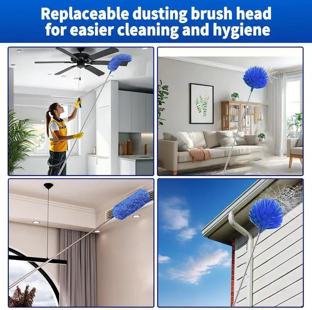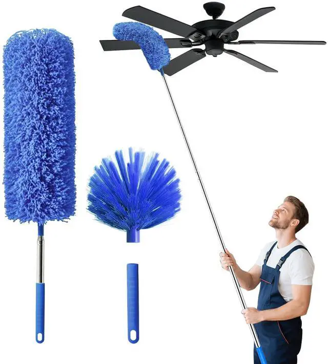 MULTIFUNCTIONAL CLEANING SET: The ceiling fan duster set includes 1 cobweb duster, 1 microfiber duster and, 1 aluminum telescopic pole and a short handle. This chicken feather duster set is ideal for cleaning furniture, ceilings, ceiling fans, stairs, sofas, window sills and cobwebs.