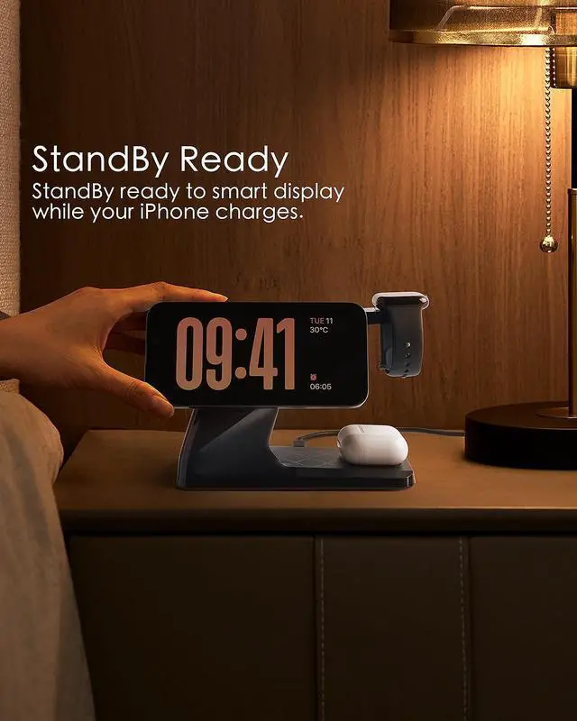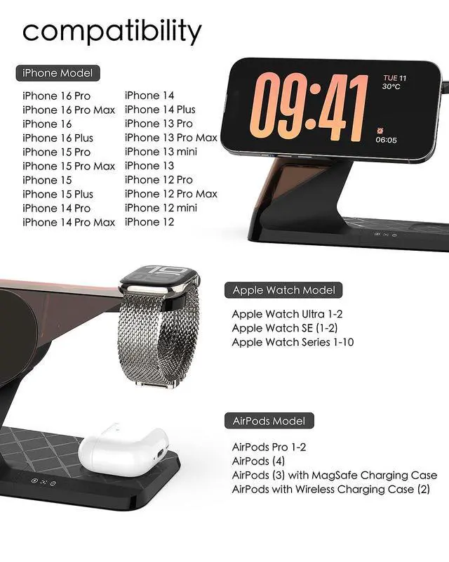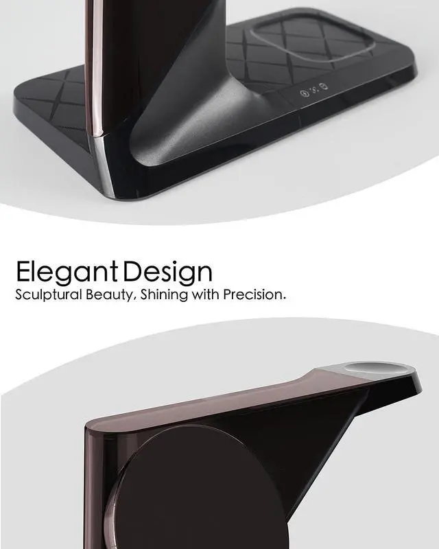 Introducing the 3 in 1 Charging Station for Apple Devices, a sleek and efficient solution for charging your iPhone, Apple Watch, and AirPods simultaneously. This innovative charging stand utilizes Mag-Safe technology for secure and effortless alignment of your iPhone, while the heavy and stable base with silicone anti-slip pads ensures a steady grip. Crafted from high-quality translucent polycarbonate and aluminum alloy, this charging station combines durability and elegance, seamlessly blending into any space. Stay informed with the smart indicator light that displays the charging status, and rest assured with built-in safety features like over-current protection, temperature monitoring, and excellent heat dissipation design.