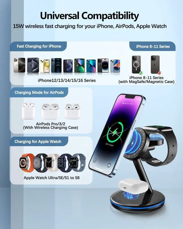 | Specifications | 18 watts, 120 volts, 9 volts, 2 amps, USB, 2, type_a_2pin_na, Battery Powered, FCC, ?iPhone?iPhone 17/17 Pro/17 Air/17 Pro Max, iPhone 16, iPhone 16 Plus, iPhone 16 Pro, iPhone 16 Pro Max,Phone 15, iPhone 15 Plus, iPhone 15 Pro, iPhone 15 Pro Max, Phone 14, iPhone 14 Plus, iPhone 14 Pro, iPhone 14 Pro Max, iPhone 13 mini, iPhone 13, iPhone 13 Pro, iPhone 13 Pro Max,iPhone 12, iPhone 12 Pro, iPhone 12 Pro Max, iPhone 12 mini, ?Note?iPhone 8-11 series Must have MagSafe/Magnetic cases; ?iWatch?Apple Watch Ultra, S8, S7, S6, SE, S5, S4, S3, S2, S1; ?Airpods?AirPods Pro/Pro 2/3/2(Wireless Charging Case Version), w365, XEITIN |
