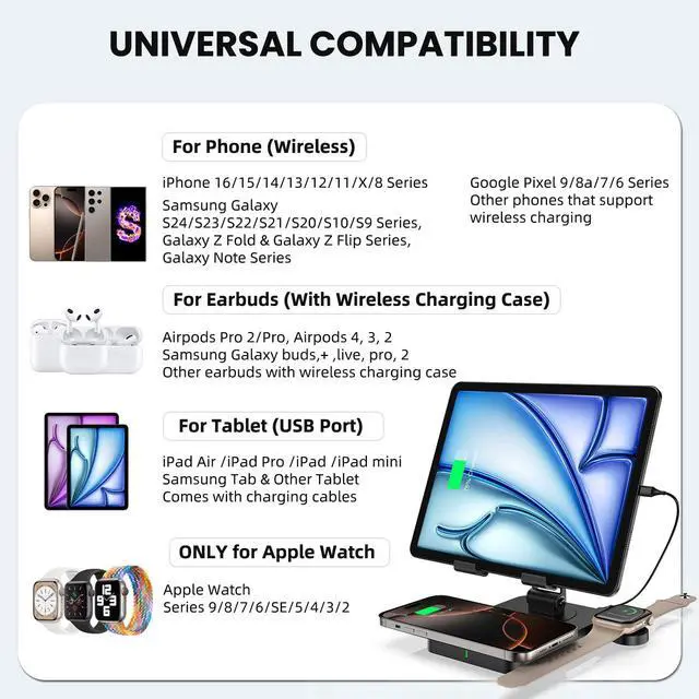 Designed for apple charging station : For apple all in one charging station can charge iPhone, Apple Watch, ipad and AirPods at the same time.