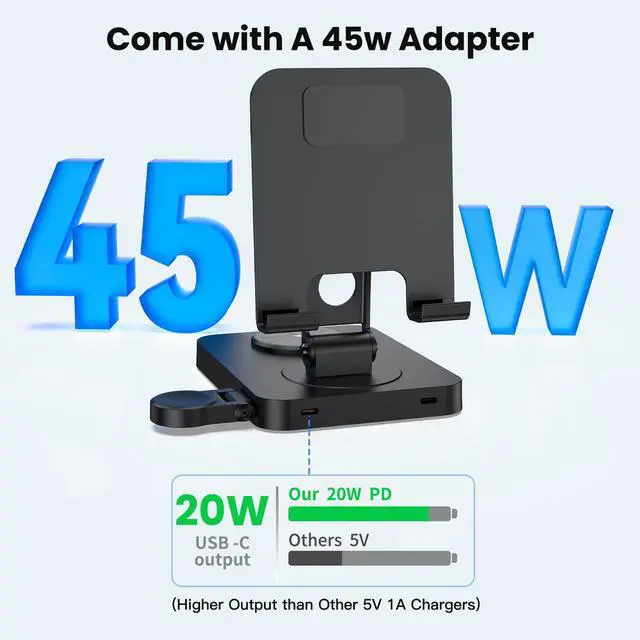 - [What You Got]You will get 1 x 3 in 1 Wireless Charger Station, 1 x 45W Charging Adapter, 1 x 1.2m charging cable (use for Adapter), 1 x 0.5m Type-C charging cable(use for USB port), and 1 x User Manual. It is the best holiday gift for personal use or to father, family and friends. If you have any questions, please feel free to contact us.