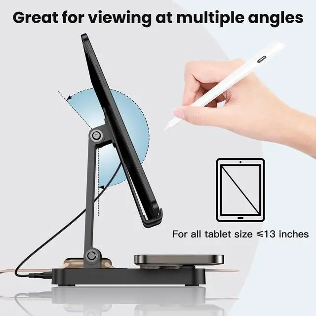 USB port and iPad charging stand design - 1.The iPad stand is made of high quality aluminum alloy, which is solid and durable. 2.With the foldable and adjustable angle design, you can adjust the angle you want at will, so you can easily enjoy movie, chatting while your iPad is charging.