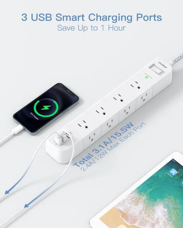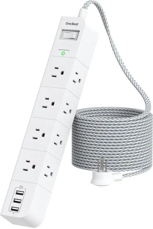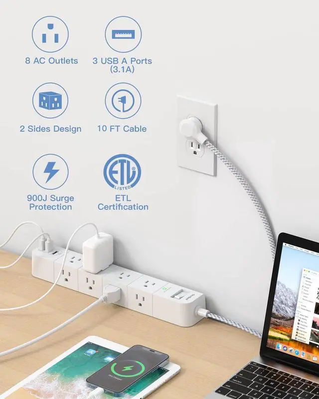 Power everything on your desk with this single compact surge-protected extension cord. This usb power strip offers 8 AC outlets 3 usb ports with surge protector for charging your computer, laptop, phone, camera, and more. 15A heavy-duty extension cord can handle more home and office appliances, keep things easy and efficient.