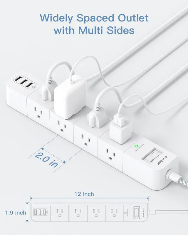 3. 10 ft Long Cord Convenient Design: Non-blocking cube design, on-off switch, 10 Ft long extension cord, low profile flat plug, wall mountable screw holes, soft indicator light.