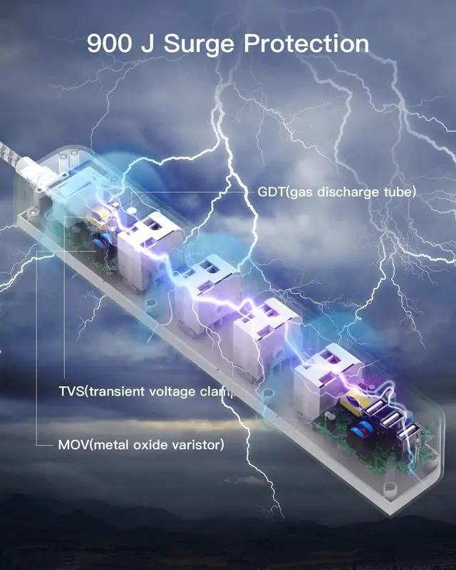 Surge protectors with 900J energy ratings protect your high-end electronics from surge attacks that can be caused by erratic power, lighting, and storms; built-in circuit breakers protect the equipment from overload.