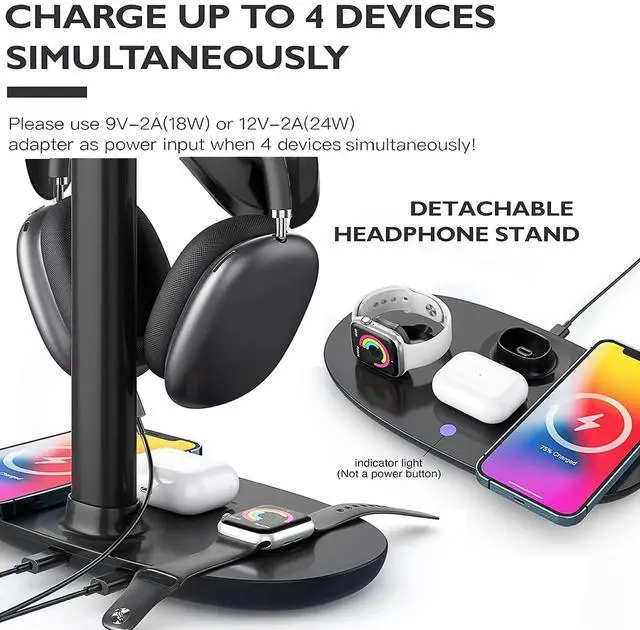 Compared to wired charging, where you need to plug in all the messy cables every time, our 4 in 1 wireless charger headphone holder unites four separate chargers to save you space and simplify your life, improve the taste of your life.