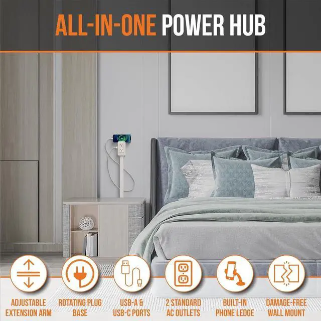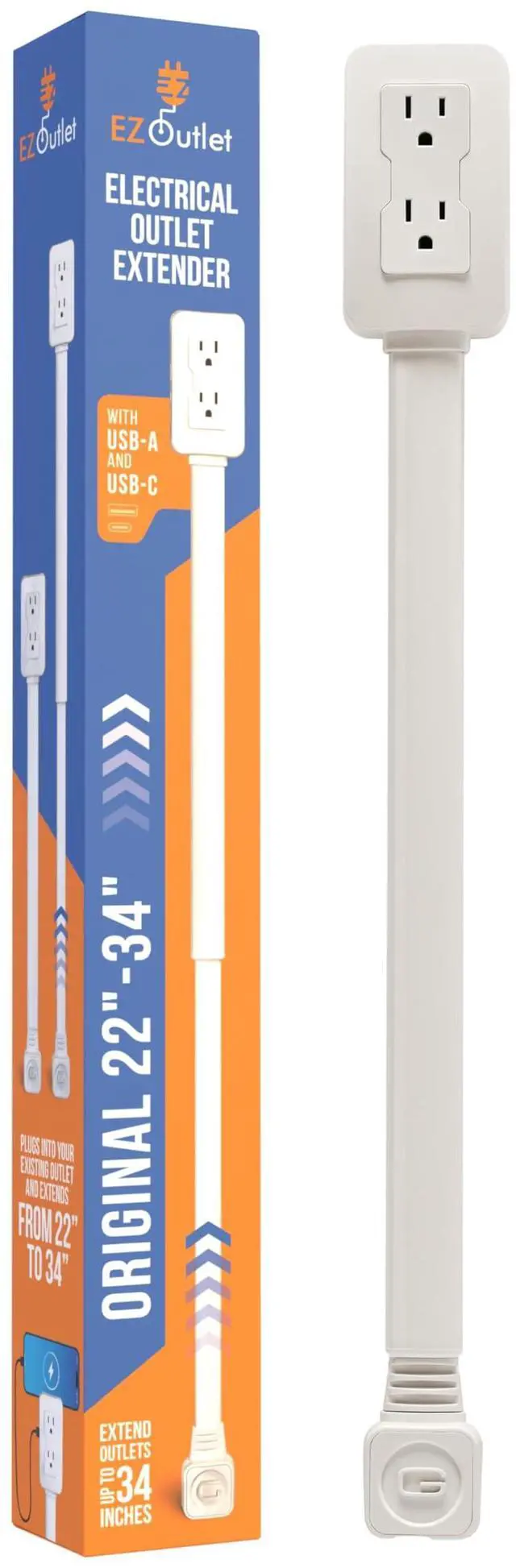 Electrical Outlet Extender. Access Hard-to-Reach Outlets! Features USB-A, USB-C, and 2 AC Outlets, Extends 22"-34", Rotates 180°. Use Behind Couches, Nightstands, Desks, and More.