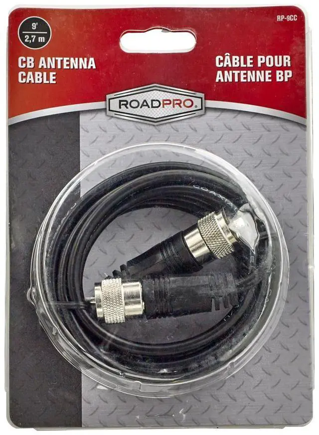 ROADPRO R RP-9CC 9 CB ANTENNA COAX CABLE WITH PL-259 CONNECTORS BLACKRG-58A/U Coaxial Cable w/Molded PL-259 Connectors for Moisture Protection For Use with Single CB Antenna SO-239 Stud Mounts 95% Shielding Coverage for Protection of RF Leaks and Interference Stranded Center Conductor for Flexibility