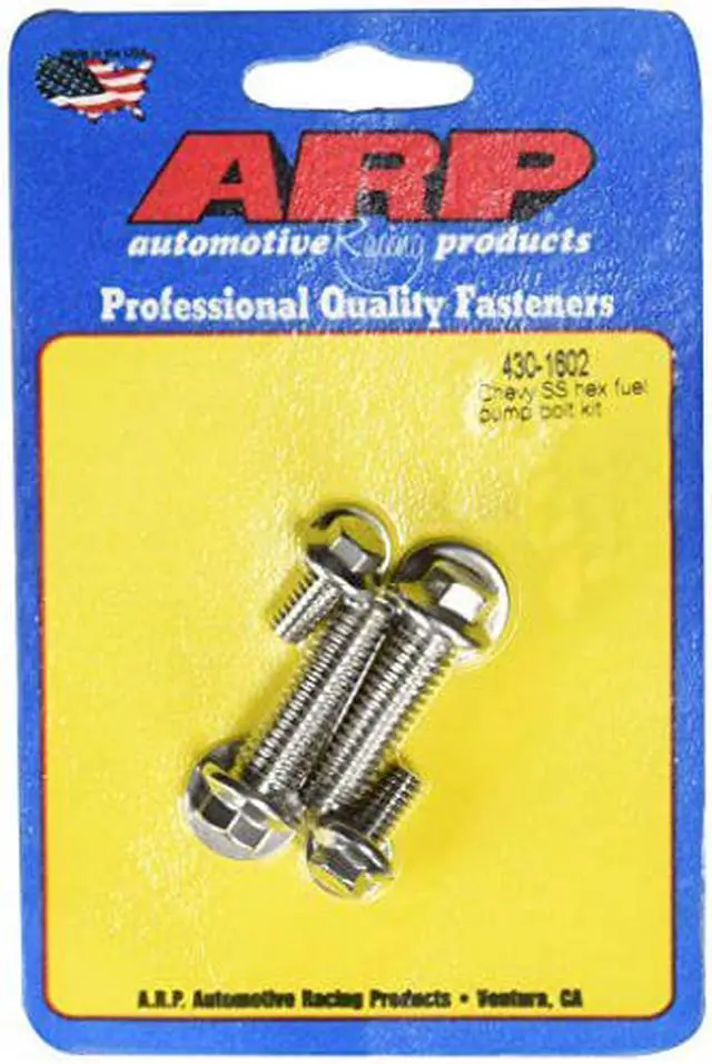 To maintain a reputation for zero defects, ensure optimum quality control, and produce fasteners of exceptionally high quality, ARP controls all aspects of the manufacturing process, performing all operations in-house where they can be closely monitored This fuel pump bolt kit is a good example of how ARP takes extraordinary steps to produce the very finest products of their kind on the market today These bolts are manufactured from rust proof stainless steel, which is rated at 170, 000 psi They feature conventional hex style heads, come complete with high quality washers, and will help you make certain that your mechanical fuel pump stays properly aligned