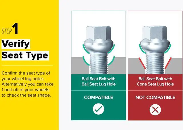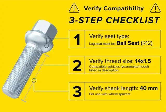 - WARNING: VERIFY VEHICLE LUG BOLT SIZE, SEAT AND THREADS. Check your vehicle's bolt thread size, as various years/models come with different size bolts. These are Ball Seat R12 shaped bolts. Make sure your wheels bolt seat have this seat type. See Diagram for Help. During Installation, ensure that your bolts get 5-8 full turns before tightening.