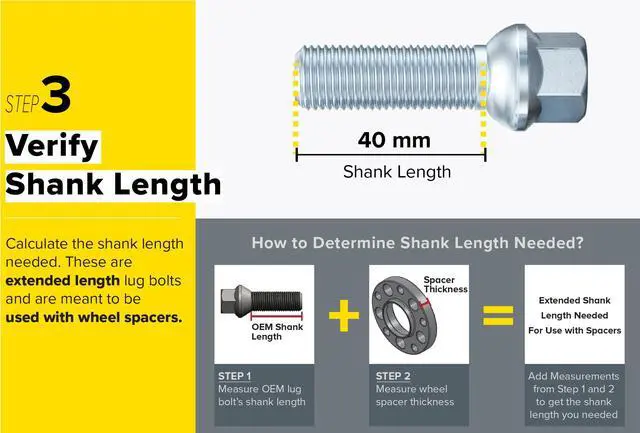- IMPORTANT: NOT OEM LENGTH. This is an extended length lug bolt, NOT an OEM replacement lug bolt. NOT to be used without wheel spacers. The correct length will depend on your OEM bolt's length and the spacer's thickness. See Diagram for Measuring Help. MEASURE BEFORE PURCHASING. Installing bolts that are too short can cause them to fall out while driving. Installing bolts that are too long may damage brake components.