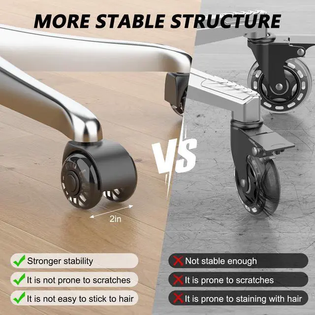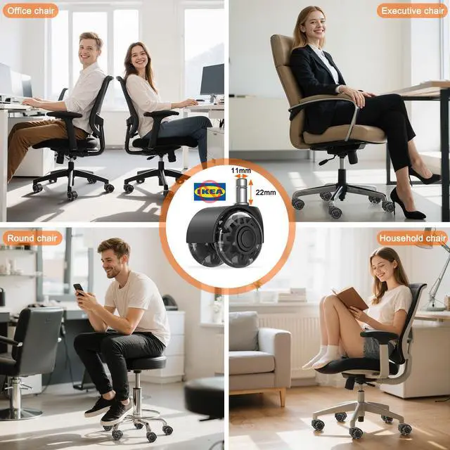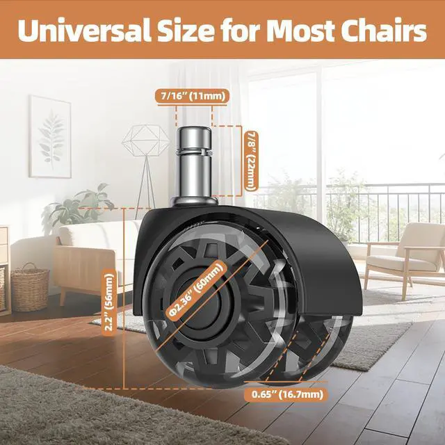 Fits most chairs (98% compatibility) No more wrestling with stuck office chair wheels. Just smooth, professional mobility that matches your work ethic.