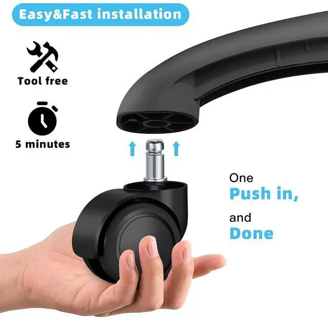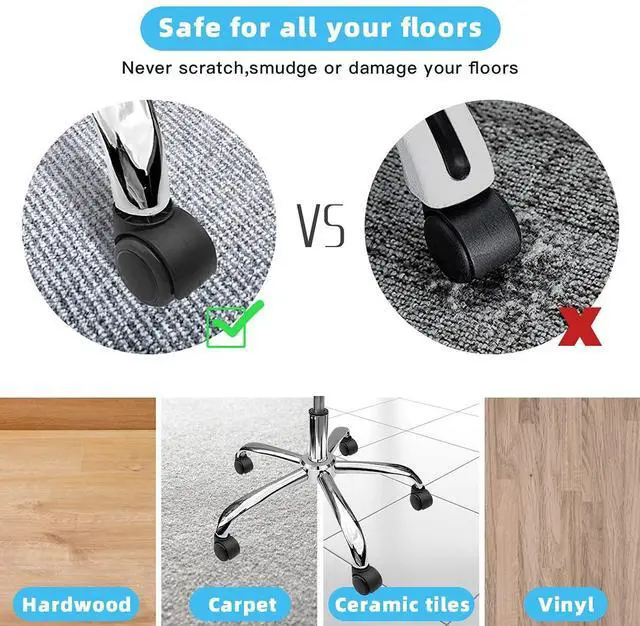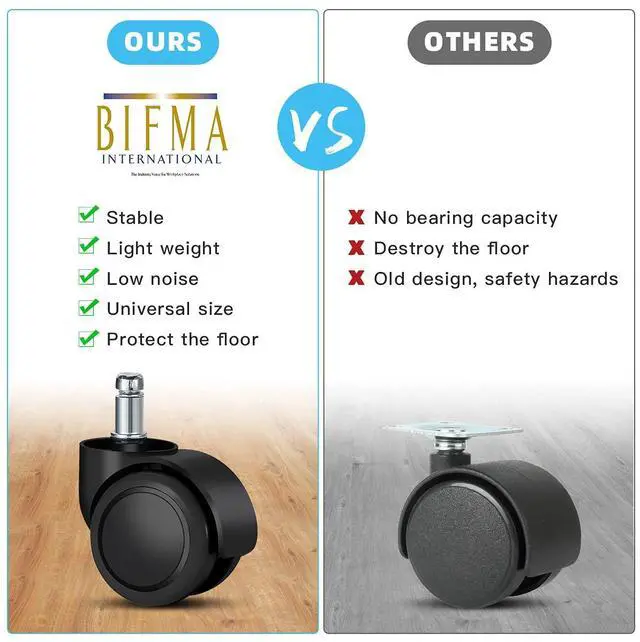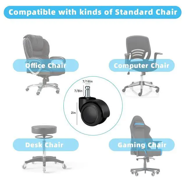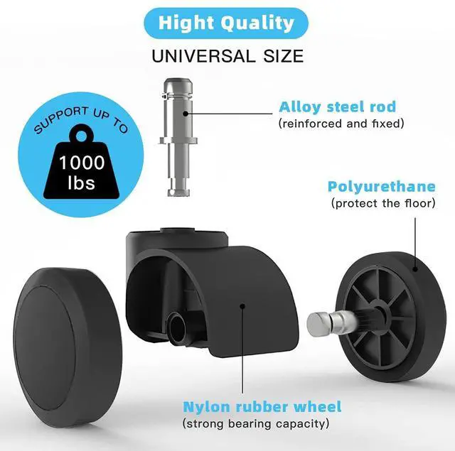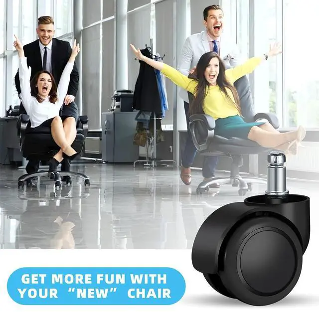 Is it troublesome because the chair wheels always make a clicking sound? Have you changed the wheels of your chair many times, making you feel exhausted physically and mentally? We have developed this unique and stylish wheel to fit most standard office and computer chairs and make your work easier. These casters we developed solve all the common problems of chair wheels and provide: smooth and silent rolling, Scratch-free floor, high load-bearing capacity (1000 lbs), easy installation and years of durability