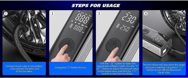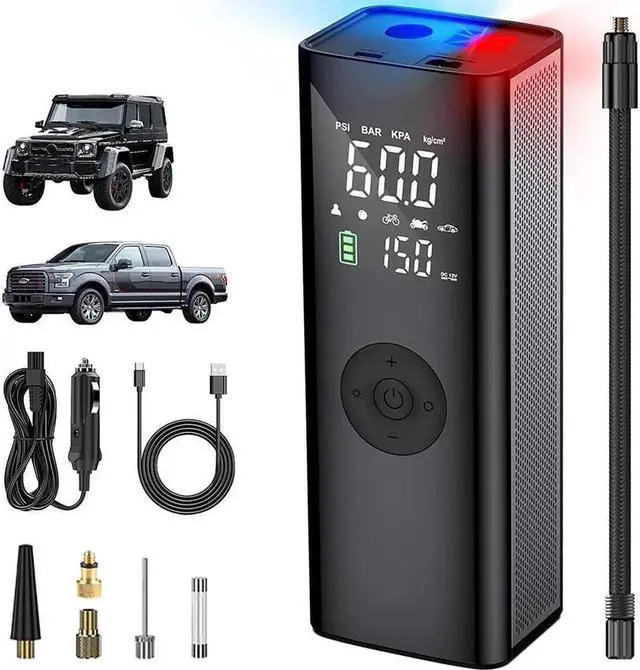 Upgraded LED & Complete Accessories3 modes and 3 colors of light, for lighting and SOS. And this portable air pump is equipmennet with Air Tube, Type-C Charging Cable, 118 inch Car Power Cable, 20A Fuse, 4 Inflatable Nozzles and Portable Bag. We wish to meet all your needs for inflation.