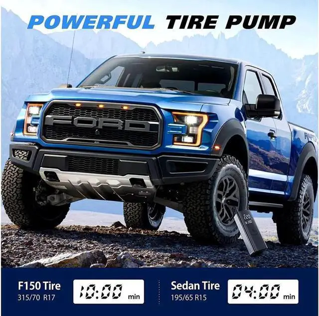 Powerful Tire PumpIt takes 10 mintues for 315 tire of F150 car, 7 minutes for 275 tire of SUV, 4 minutes for 195 tire of sedan car, 2 minutes for 150 tire of Motorcycle. The Portable Tire Inflator is fitted with Metal Movement and High-performance Chip, giving rise to Stable Performance and Long Life.