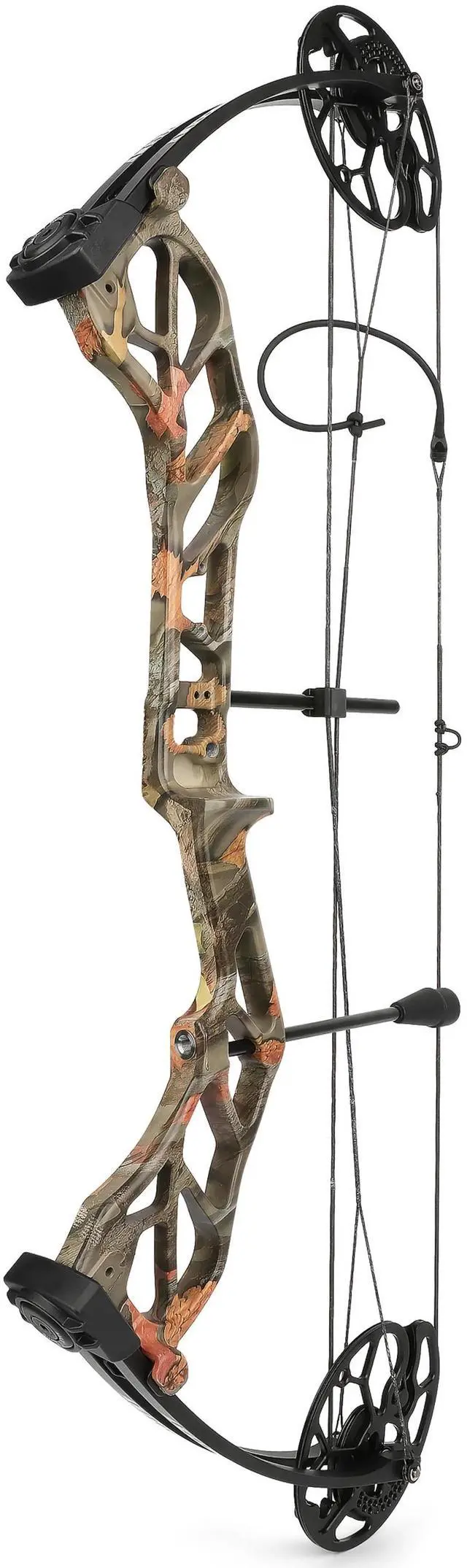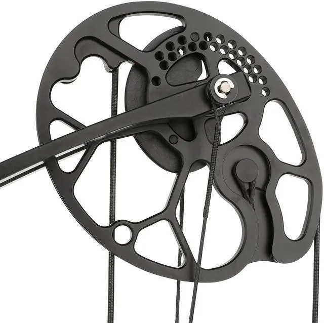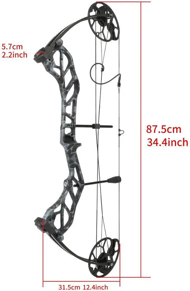 Bow handle: Aluminum alloy bow handle Surface treatment: spray coating, camouflage water transfer printing Cam: Double cam/adjustable, 6061-T6 CNC machined, with bearings Main string length: 58.68 inches Secondary string length: 33.938 inches x2 Product size: 87.5 * 31.5 * 5.7cm