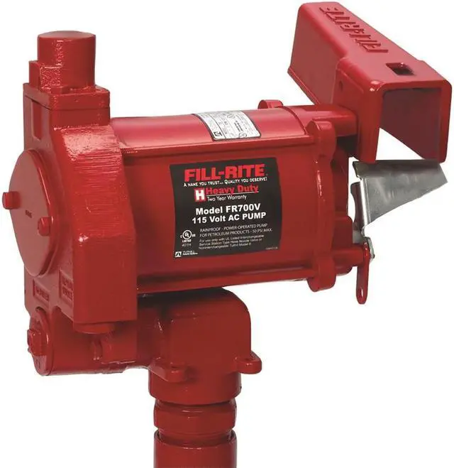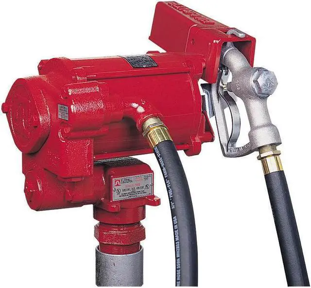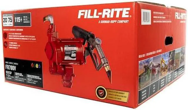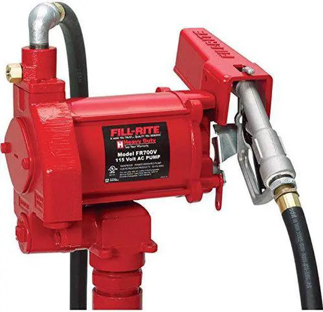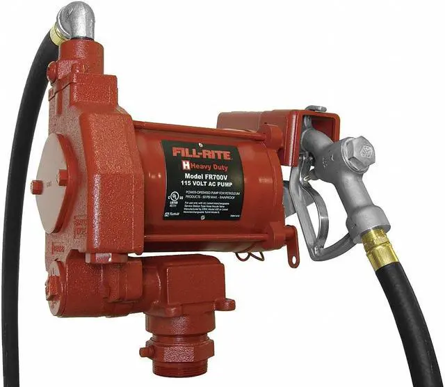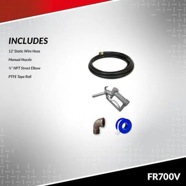 The FR700V model is a 115V AC, 20 GPM, heavy-duty fuel transfer pump. This pump and accessory bundle comes complete with a hose, nozzle, and installation components.