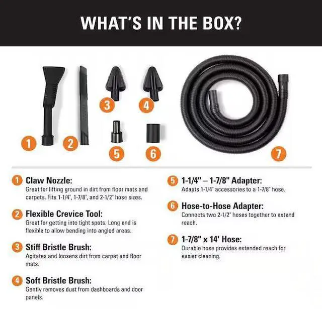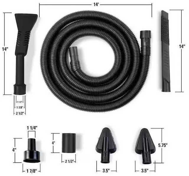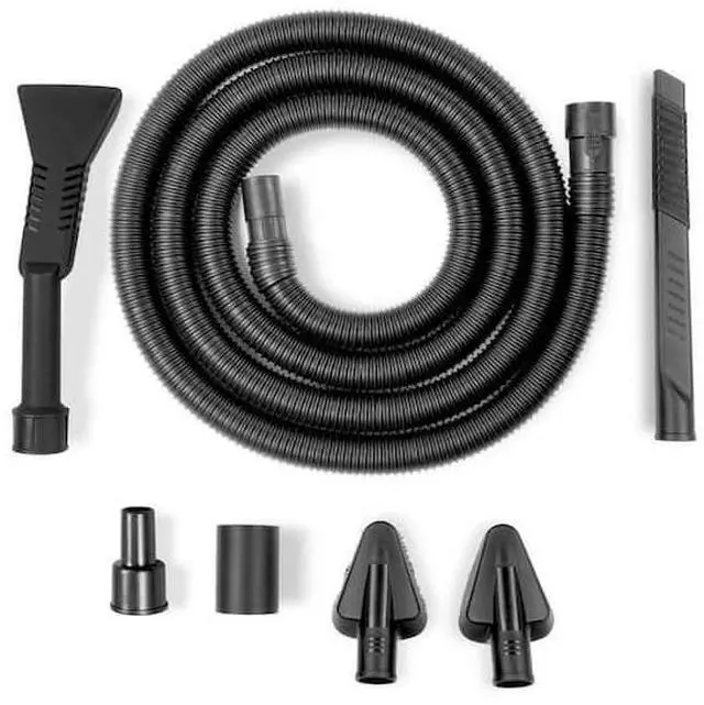 7-piece automobile cleaning kit includes a 1-7/8 in. x 14 ft. Hose, a Soft Bristle Brush, a Stiff Bristle Brush, a Flexible Crevice Tool, a Claw Nozzle, a 1-7/8 in. to 1-1/4 in. Adapter and 2-1/2 in. Hose-to-Hose Connector