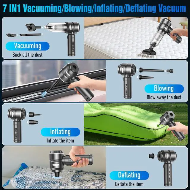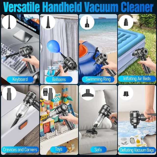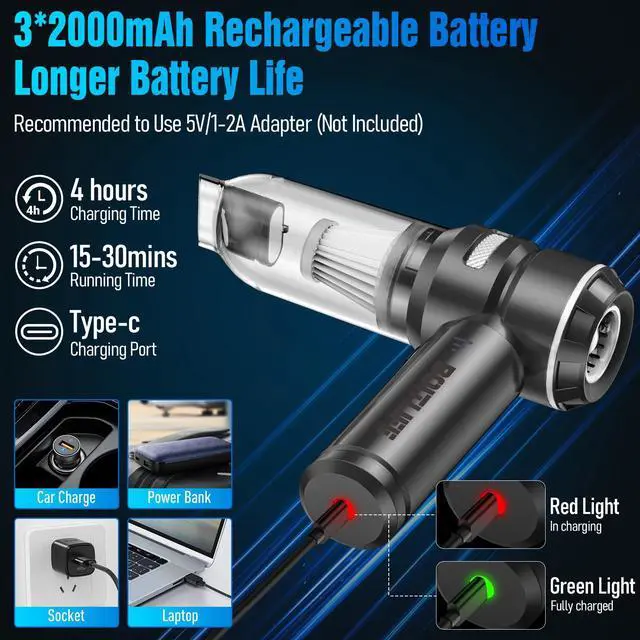 This Hand Vacuum Cordless Rechargeable combines three essential functions: a vacuum cleaner, air pump, and air duster—all in one compact device. This multifunctional car vacuum cleaner high power not only saves you money but also simplifies your cleaning process.