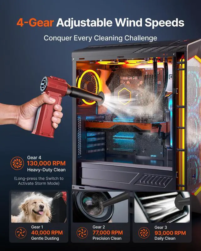 [4-Gear Adjustable Wind Speeds] Conquer every cleaning challenge. Level 1 for gentle dusting; Level 2 for precision clean; Gear 3 for daily clean; Gear 4 for heavy-duty clean (PS: long-press to activate storm mode.)
