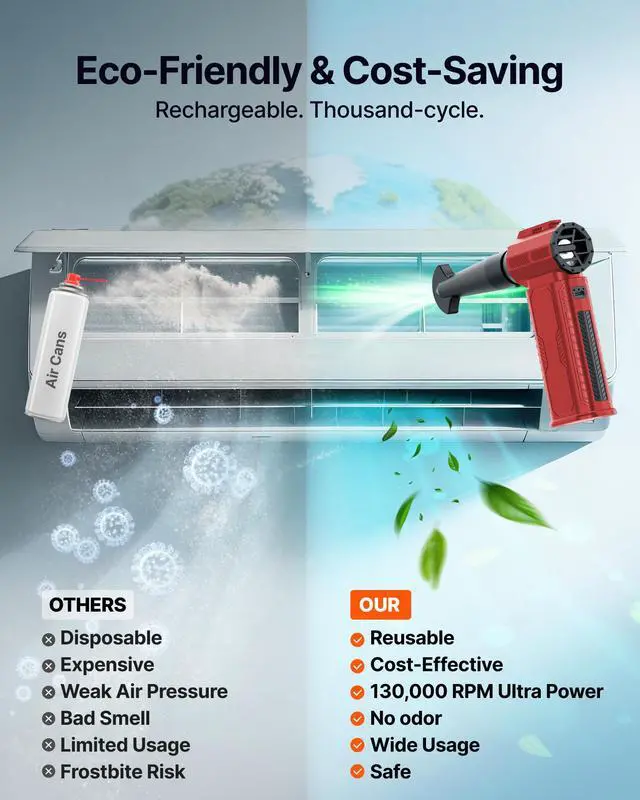 [Cost-Effective & Reusable] The rechargeable electric air duster replaces 1,000+ disposable canned air. Only dry, stable airflow, shielding your devices from damage, blending eco-friendliness with high-tech precision.