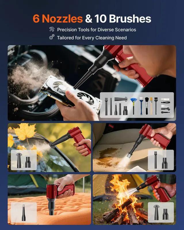 [6 Versatile Nozzles & 10 Detail Brushes] Offer tailored solutions for every cleaning task, from delicate computer keyboards and sensitive electronics to car detailing, home deep cleans, and even outdoor inflation tasks. One tool, infinite mastery.