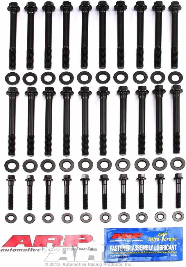 All Pro Series bolts are cold forged to ensure molecular integrity, heat treated prior to thread rolling and machining, and are rated at 200,000 PSI tensile strength. ARP Pro Series head bolt kits are application specific, designed for use with typically competition only components. These fasteners deliver superior strength and meet the ARP zero defect zero failure quality standard. Hardened and parallel ground washers are included with each kit to ensure even load distribution and accurate torque readings. All Pro Series head bolts have a reduced wrenching hex or 12 point head and wide area flange to eliminate the need for valve train removal for cylinder head retorquing and permits the use of larger diameter valve springs. Most applications have undercut short bolts that can help eliminate head gasket failures through providing more stretch to compensate for the additional compression of gaskets.