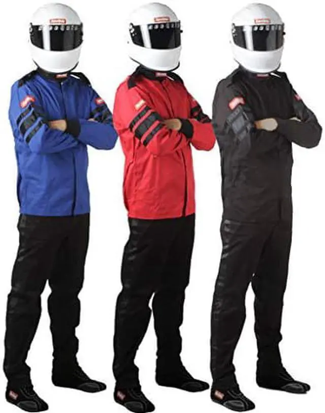 All driving jackets are assembled with heavy-duty, multi-needle, over-lock safety stitch machines to provide exceptional seam strength. Stylish contrasting armband stripes match the full-length leg stripes on RaceQuip driving pants.