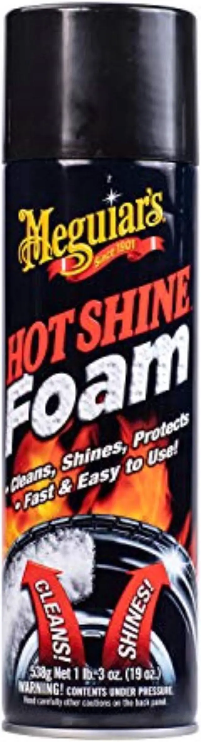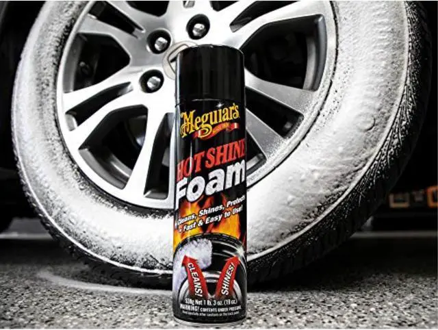 Clean, shine and protect your tires in one convenient and easy step. Meguiar? s Hot Shine Tire Foam powers through buildup to reveal a deep black shine. The thick, active foam lifts and releases dirt and grease while creating a glossy black sheen. The easy-to-use foam clings to the rubber so it stays where you spray, then dissolves clear for less mess. With its water-resistant polymers and UV technology, this formula gives your tires a clean, shiny, well-maintained look for weeks on end.