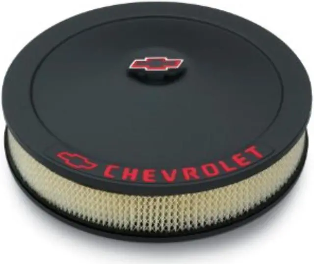Air Cleaner Assembly - Classic - 14 in Round - 3 in Element - 5-1/8 in Carb Flange - Flat Base - Red Chevrolet Logo - Steel - Black Crinkle - Kit