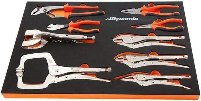 Set Includes: 7 Diagonal Cutting Pliers - Comfort Handle. 6 Long Nose Pliers - Comfort Handle. 9-1/2 Groove Joint Pliers - Comfort Handle. 8 Linesman Pliers - Comfort Handle. 10 Curved Jaw - Locking Pliers. 10 Straight Jaw - Locking Pliers. 11 Locking Clamp With Swivel Pad. 9 Long Nose- Locking Pliers. 9 Locking Welding Clamp.