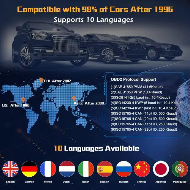 Compatible with cars 1996+ US, 2002+ EU, 2008+ Asia Supports 10 languages – English, Spanish, French, German, Italian, Portuguese & more.