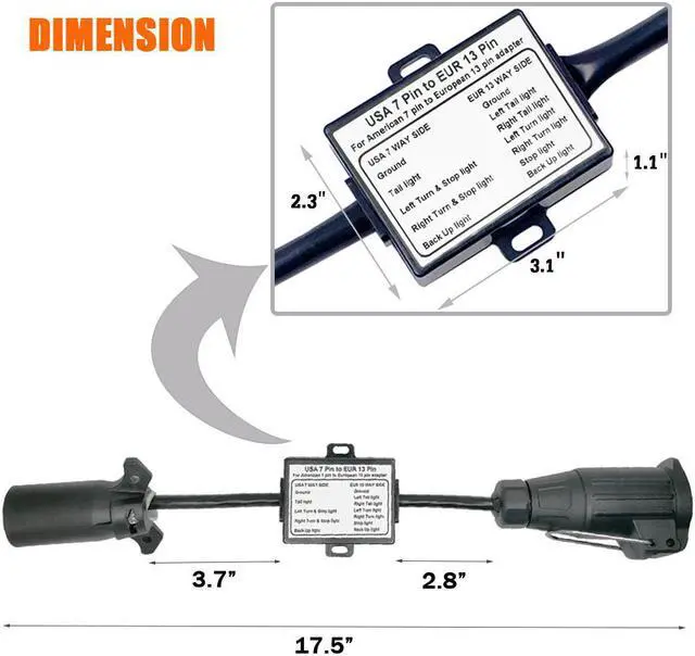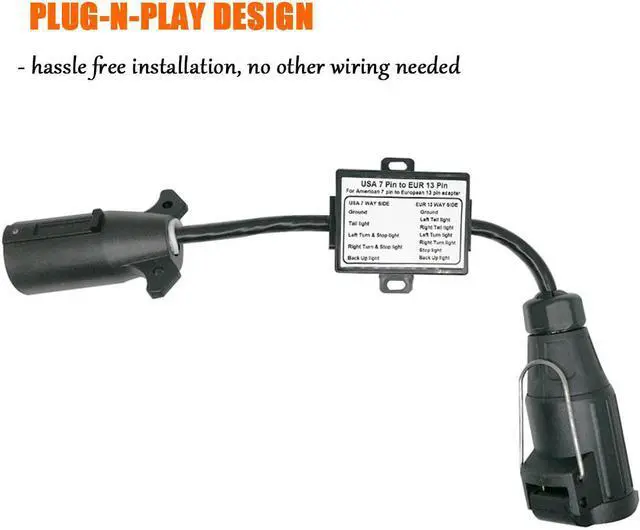 This fantastic Trailer Light Converter made by Carrofix is designed for separating "stop" signal from the Two-Wire System US Vehicle to connect your European Trailer (caravan, boat trailer, bike carriers and others). It provides a electrical solution that if you have a US vehicle with 7 way blade, and you want to hook up a European trailer, with a 13-way Round Pin. If your US vehicle has the 7-Pole RV Blade Socket, and your European trailer has the 13 pin round plug, where your US car need to separate the stop and tail signals, this Trailer Wiring Connector will need to be use.