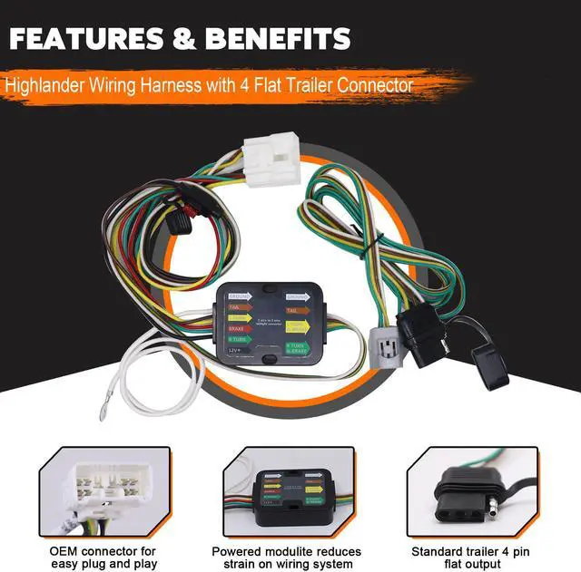 This particular plug-in T-connector harness provides a 4-way flat socket and is designed to fit for 2020 - 2023 Toyota Highlander (factory tow package may be required). It provides a 4-way flat connector to power your trailer tail lights, brake signal lights and turn signals. It comes with all necessary wiring parts to support a reliable trailer wiring connection, as well as a dust cover to keep the connection points clean and well protected when the connector is not in use.