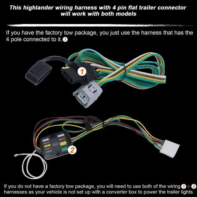 The custom fit wiring harness with 4 pin flat trailer connector will work with both models. If you have the factory tow package, you just use the harness that has the 4 pole connected to it. If you do not have a factory tow package, you will need to use both of the wiring harnesses as your highlander is not set up with a converter box to power the trailer lights.