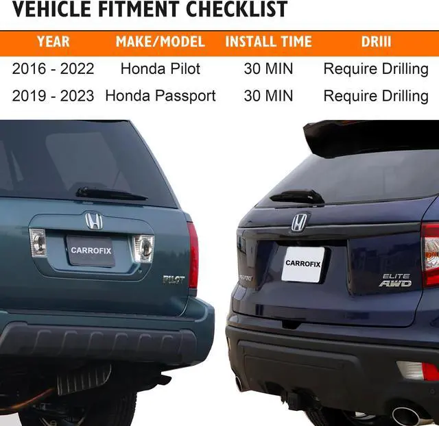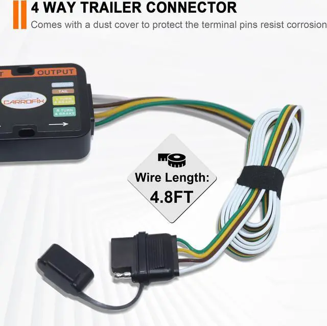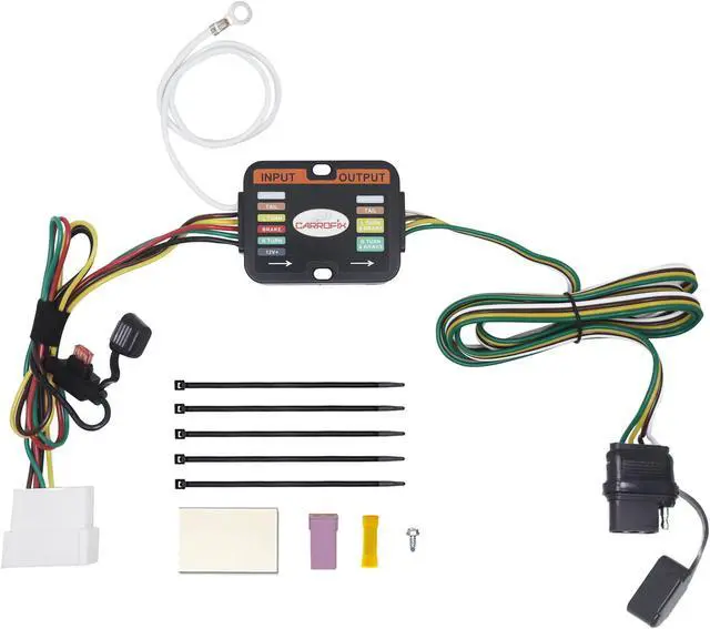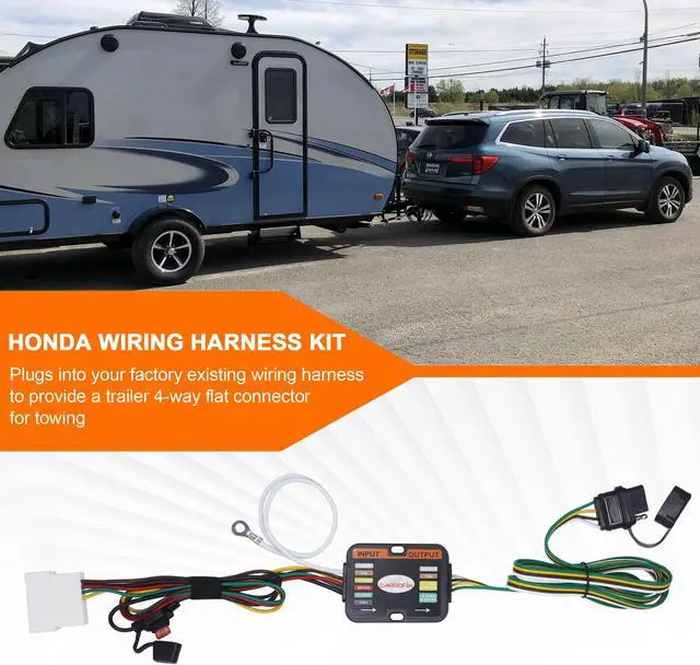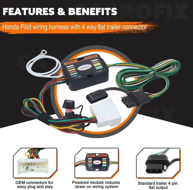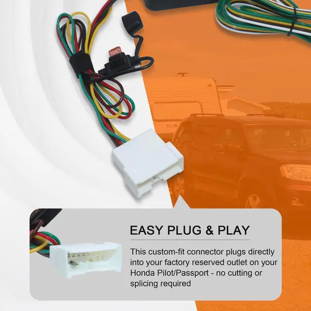 This plug-in wiring harness provides a 4-way flat connector and is designed to be a custom wiring option for 2019 - 2023 Honda Passport; 2016 - 2022 Honda Pilot. It provides a 4-way flat connector to power your trailer tail lights, brake signal lights and turn signals. And comes with all necessary wiring parts to support a reliable trailer wiring connection, as well as a dust cover to keep the 4 flat connector points clean when not in use.