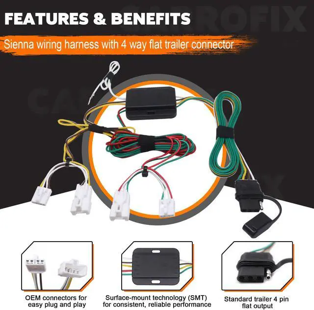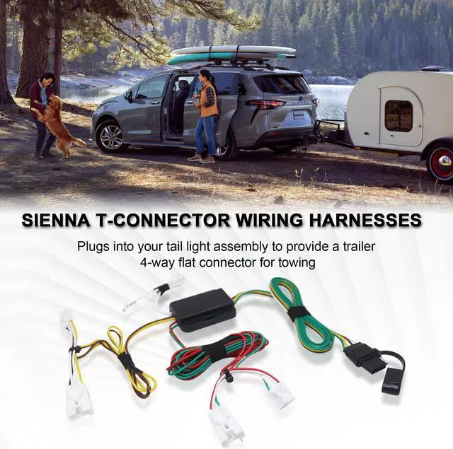 This particular plug-in harness will be required if you need to add a trailer wiring harness that without the factory connector/package for your 2004 - 2010 Toyota Sienna. It provides a 4-way flat connector to power your trailer tail lights, brake signal lights and turn signals. It comes with all necessary wiring parts to establish a reliable trailer wiring connection, as well as a dust cover to keep the connection points clean and well protected when the connector is not in use.