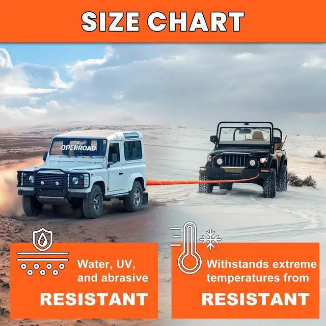 1"x30ft tow rope with a lab tested and certified breaking strength up to 48,000lbs. High quality materials and workmanship, 100% best Nylon N66 rope, double braided structure, sand and mud will not get in. The rope can withstand extreme temperatures between -40 degrees and up to 215 degrees Fahrenheit. Ensure reliable working ability in various off-road scenarios, suitable for large sized SUVs, tractors, Jeeps, ATVs, UTVs, snowmobile and small trucks.