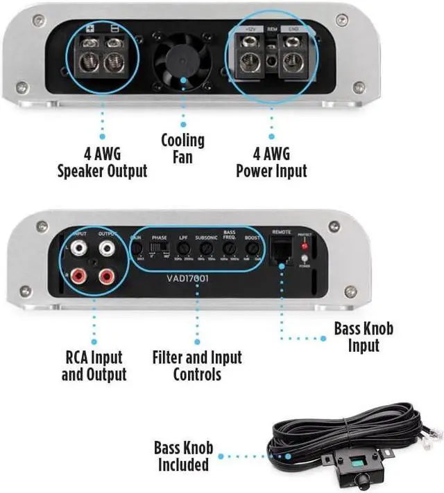 BASS REMOTE: Variable Bass Boost 0 - +12 dB @ 45 Hz. Easily adjust with the included bass remote.