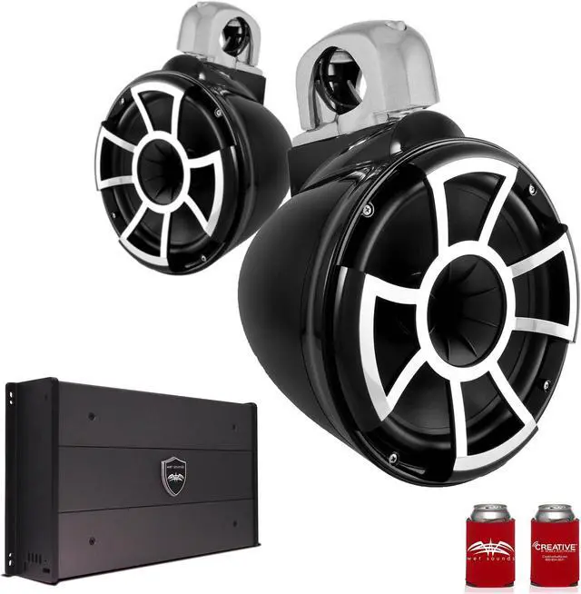 Wet Sounds REV10B-FC-SA 10" Black Tower Speakers with Silver Aluminum Fixed Clamps & SYN-DX2.3 1200 Watt Amplifier - This bundle includes a pair of Wet Sounds REV10B-FC-SA 10" Black Tower Speakers, a Wet Sounds SYN-DX-2.3HP SYN-DX Series Marine Amplifier, and a Wet Sounds coozy.