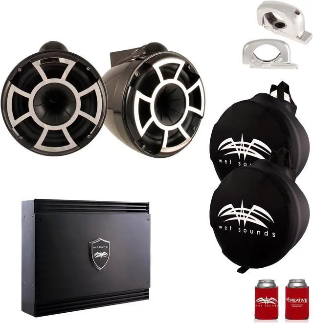 Wet Sounds Black REV 10 Fixed Clamp Tower Speakers with Wet Sounds SDX2 1250 Watt Amplifier & Suitz Speaker Covers- This bundle includes a pair of Wet Sounds REV 10 Fixed Clamp Tower Speakers, an Wet Sounds Sinister SDX2 2-Channel Amplifier, a pair of Wet Sounds Speaker SuitZ for REV10 & PRO80, and a Wet Sounds coozy.