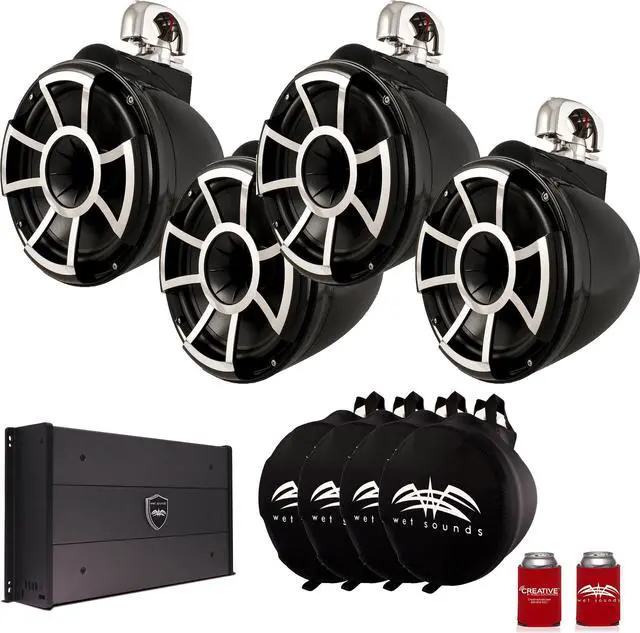 Wet Sounds Two Pairs of Black REV 10 Swivel Clamp Tower Speakers with Wet Sounds Suitz speaker Covers & SYN-DX-2.3HP Amplifier- This bundle includes 2 Pairs of Wet Sounds REV 10 Swivel Clamp Tower Speakers - Black, a Wet Sounds SYN-DX-2.3HP SYN-DX Series Marine Amplifier, two pairs of Wet Sounds Suitz -Speaker SuitZ, and a Wet Sounds coozy.