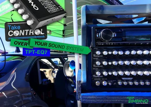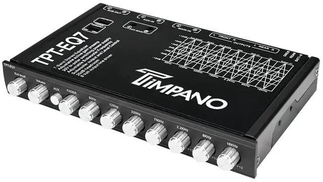 Timpano TPT-EQ7 is a 1/2 DIN 7-band graphic equalizer designed to fully control your car audio system to its utmost potential. This equalizer was specifically created for the mobile environment and provides powerful features in a compact size. Featuring 7 adjustable frequencies, 2 inputs, subwoofer level control, 6 channel output, and selectable illumination color, the TPT-EQ7 is an unbeatable value.