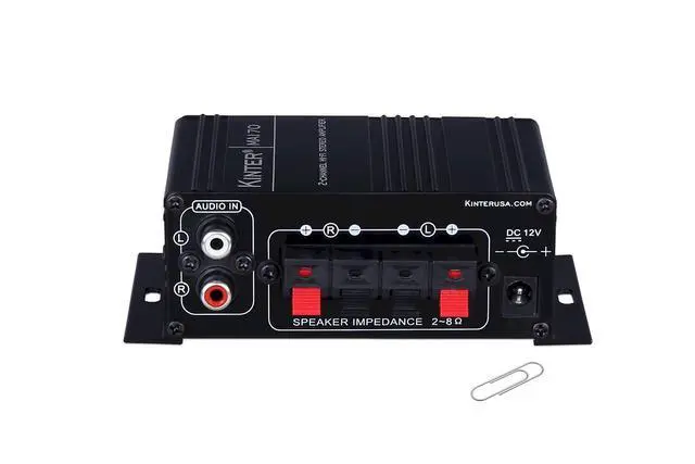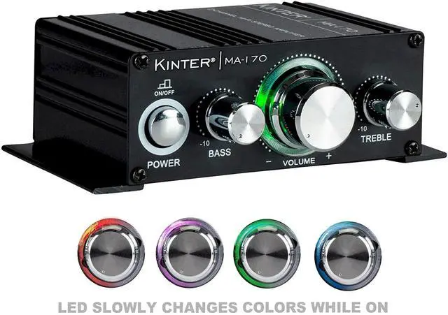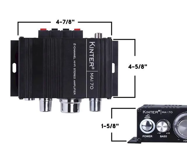 The Kinter MA170 is the real deal! You can use the MA-170 in a 2-channel home audio system, or build its capability into a portable unit that can be taken anywhere. RCA inputs and convenient spring terminal outputs will work with virtually any source and speakers to create a great sounding audio system. The black anodized aluminum housing's integrated mounting tabs make it easy to mount the amp anywhere. The glowing LEDs really set the mood for any music genre.
