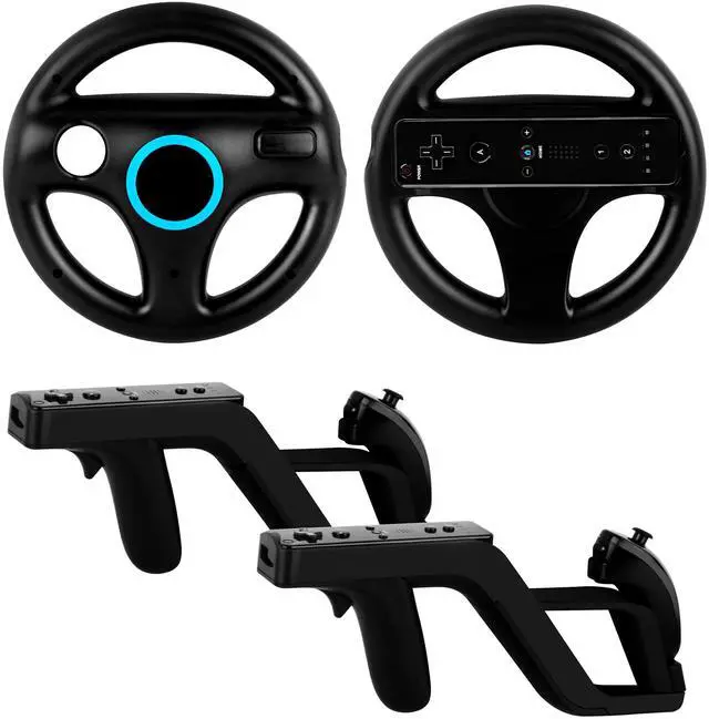 4-in-1 Complete Wii Gaming BundleUpgrade your Wii experience with this game set that includes 2 steering wheels and 2 light guns. Perfect for multiplayer racing games (Mario Kart, Need for Speed) and action games (House of the Dead, Resident Evil) - everything you need for competitive family fun (Nunchuck and Wii Remote not included)