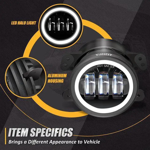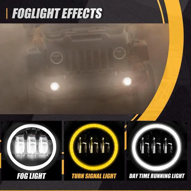 - HALO RING FUNCTION - Three lighting pattern (Fog Light, Turn Signal Light, Day Time Running Light). DRL light with white halo ring and Turn signal function with amber halo ring. Providing high fogligt effects.
