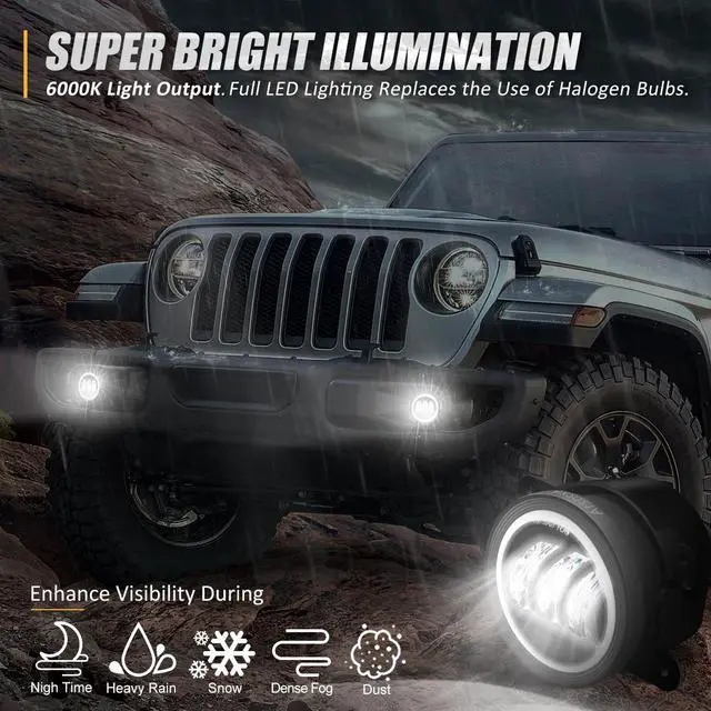 - SUPER BRIGHT - Full LED Lighting Replaces the Use of Halogen Bulbs. LED Halo Light. 6000K Light Output. IP67 Waterproof Design allows your vehicle to keep lighting in bad weather and night time. Projector Beam Type for more Focused Lighting.