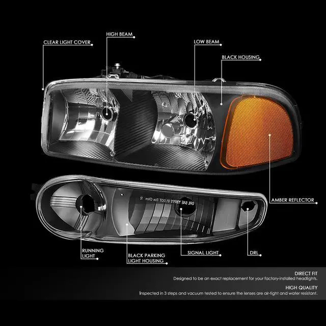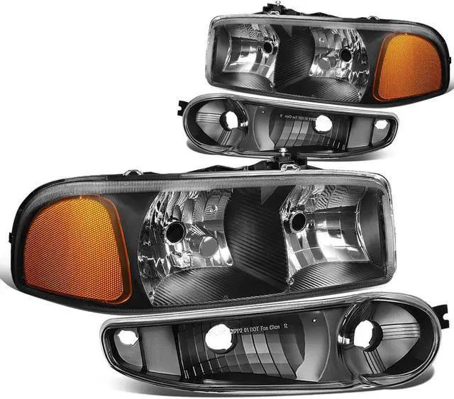 DNA Motoring HL-OH-DAN994P-BK-AM For 2001 to 2007 GMC Sierra C3 Yukon Denali 4Pcs of Black Housing Amber Corner Headlights + Bumper Lamps 02 03 04 05 06 Left + Right