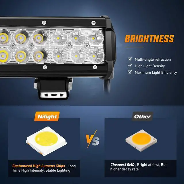 High-quality LED chips emit bright and white light. Its perfect combination of flood beams provides wide-spread illumination, light up the darkness.